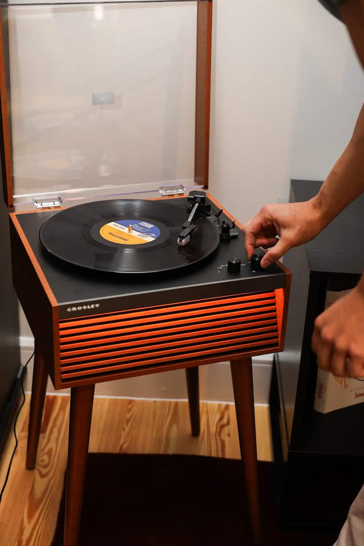• Entretenimiento: televisor inteligente (inicia sesión en tus aplicaciones) + reproductor de discos habilitado para Bluetooth con vinilo curado
