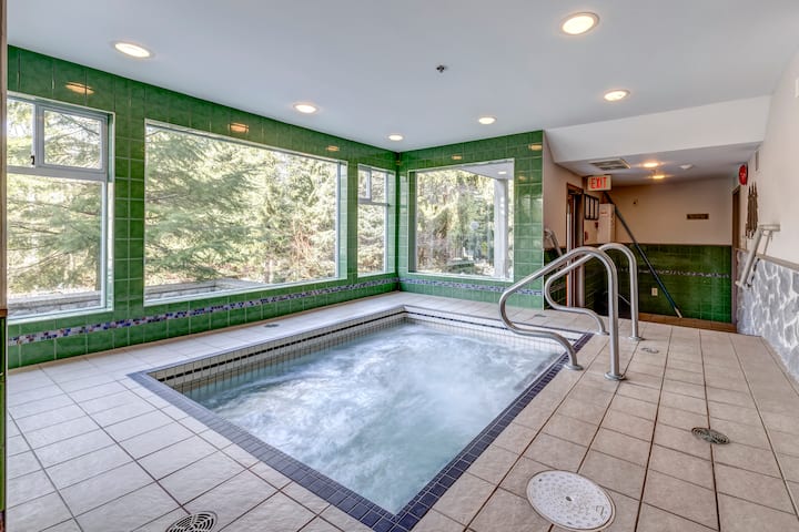Bienvenido a la Unidad 318 en Greystone Lodge, un refugio alpino que combina la calidez de un refugio familiar con las majestuosas vistas de los paisajes de Whistler. Ubicado en el tercer piso, este santuario de un dormitorio más loft cuenta con una espaciosa cama tamaño king y dos camas individuales en la suite principal, completa con un baño privado para mayor privacidad. El loft ofrece dos acogedoras camas individuales, mientras que el lujoso sofá cama doble en la sala de estar garantiza comodidad para hasta 7 huéspedes.