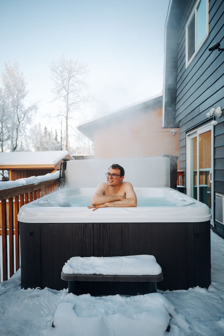 En el interior, hay espacio para instalarse, cocinar comidas reales, reunirse para noches de cine o retirarse a dormitorios tranquilos. La suite principal tamaño king se abre a un balcón privado con vistas a la montaña y aire fresco de la mañana. Dos dormitorios adicionales ofrecen literas dobles ideales para familias o grupos. Las áreas de estar, comedor y cocina fluyen naturalmente juntas, creando un espacio fácil para compartir tiempo sin sentirse abarrotado. En el exterior, una bañera de hidromasaje compartida espera bajo el amplio cielo de Anchorage para pasar las noches relajándose después de kilómetros de senderos, vientos glaciares o aventuras en la ciudad.