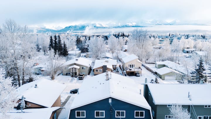 Te alojarás en uno de los vecindarios más céntricos y transitables de Anchorage: cerca de todo, pero escondido en una zona residencial tranquila con altos abetos.
