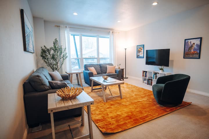Este alojamiento tiene tres dormitorios y dos baños y medio y tiene capacidad para ocho personas cómodamente. El dormitorio principal incluye una cama tamaño king, un baño en suite y un balcón privado con vistas a la montaña. Los dos dormitorios adicionales cuentan con una litera con un colchón completo en la parte inferior y un colchón doble en la parte superior que funciona bien para niños, adolescentes o adultos que prefieren espacios para dormir separados. La sala de estar, el comedor y la cocina están diseñados para compartir tiempo sin sentirse abarrotados. Hemos diseñado todos los espacios comunes para alojar a los 8 huéspedes cómodamente.