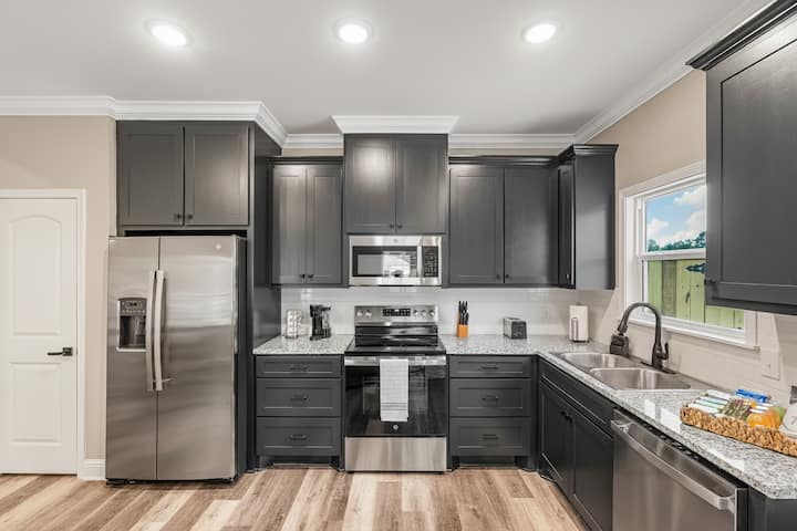 Bienvenido a este acogedor alojamiento de un solo nivel de 4 dormitorios en el corazón de Ruston, ideal para familias, visitas universitarias o estancias de negocios. Con capacidad para 8 personas con una cama tamaño king y tres camas tamaño queen, el alojamiento cuenta con wifi rápido, 4 televisores de transmisión HD, una cocina de chef totalmente equipada y una amplia sala de estar/comedor. Disfruta de un patio trasero privado, entrada sin llave fácil y estacionamiento gratuito, todo a minutos de Louisiana Tech, complejos deportivos, parques y restaurantes locales. ¡Reserva tu estadía hoy mismo!