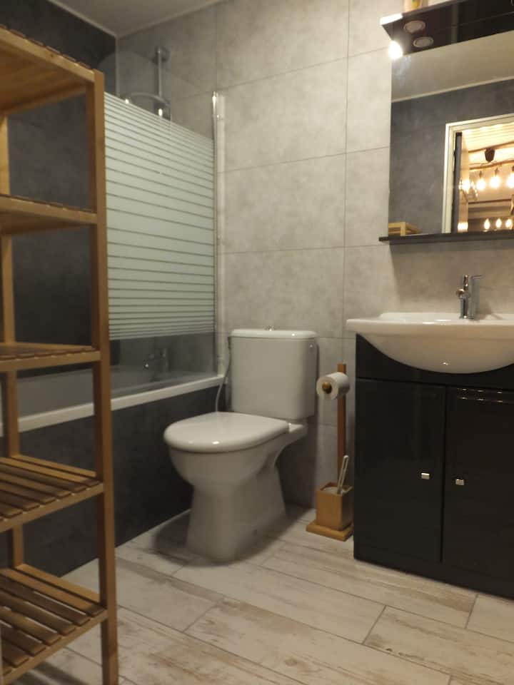 En la primera planta encontrará el apartamento de 8 personas. que consta de una hermosa sala de estar cocina - sala de estar - comedor, un dormitorio con una cama de matrimonio, un dormitorio con 2 x 2 literas y un baño. Podrá hacer una chimenea y admirar, desde la terraza, la vista del valle y el macizo de Vercors. Superficie total del apartamento: 44 m²