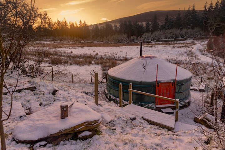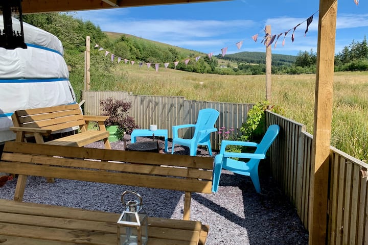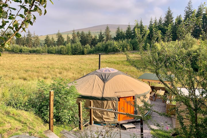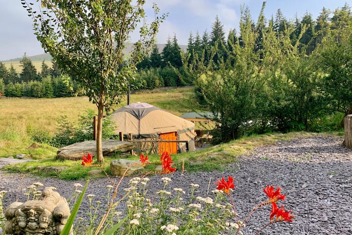 Auténtico ger mongol (yurta) con cocina independiente, ducha y aseo, ubicado en el bosque de Cynwyd en lo alto de las hermosas montañas Berwyn en el norte de Gales en nuestra propiedad ecológica fuera de la red.