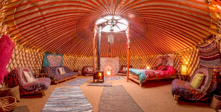 Ty Crwn Mawr es una yurta muy cómoda con vistas espectaculares que pueden alojar fácilmente a siete personas. Tiene una cama tamaño king y seis futones individuales que se doblan como sillas/sofás. Está bellamente amueblado con hermosas sábanas, tapices, alfombras y luces de hadas que crean un espacio cálido y mágico.