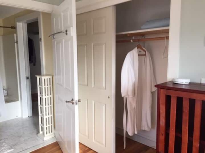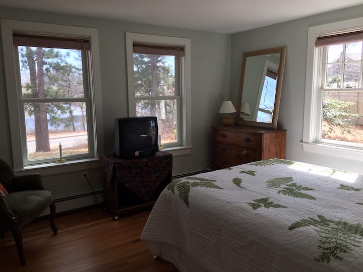 Encantador dormitorio privado y baño con vistas al estanque
