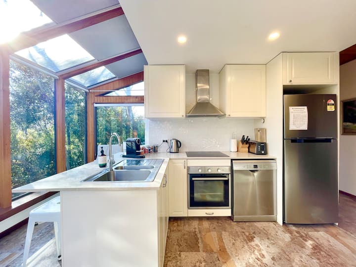 En el exterior, la generosa terraza privada tiene vistas a los tranquilos jardines nativos y ofrece un espacio soleado para relajarse, con una parrilla a gas y un comedor al aire libre. Pasea por los senderos del jardín y descubre rincones tranquilos para momentos de descanso y de inmersión en la naturaleza. La casa se encuentra en una zona residencial tranquila con vecinos a ambos lados, por lo que es más adecuada para grupos de bajo impacto y considerados. Hay estacionamiento disponible para hasta cuatro vehículos, dos en la entrada y dos directamente frente a la casa.