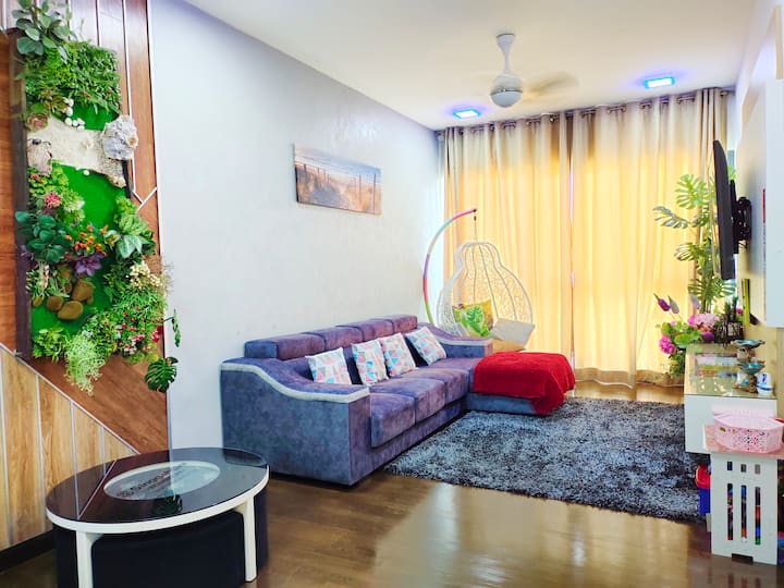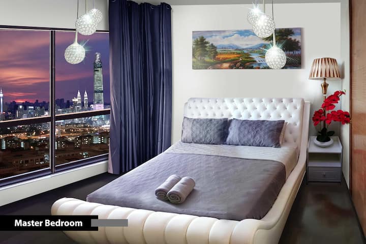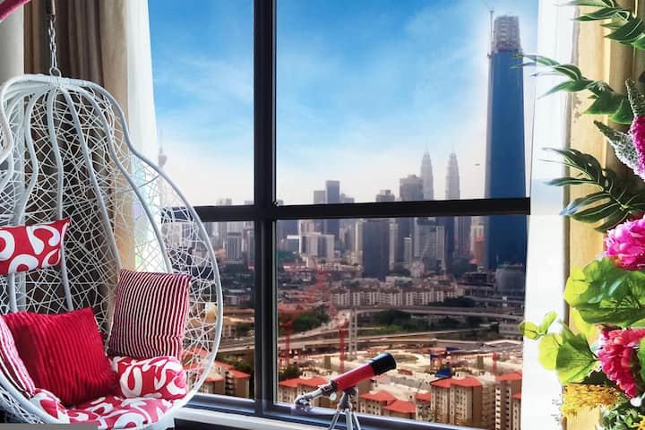 Aquí puede simplemente relajarse en la cama en el dormitorio principal o descansar cómodamente en la silla colgante junto a la ventana, escuchando música relajante al fondo y disfrutar de la vista panorámica del horizonte de KL como la torre KL, las torres gemelas KLCC y TRX majestuosamente.