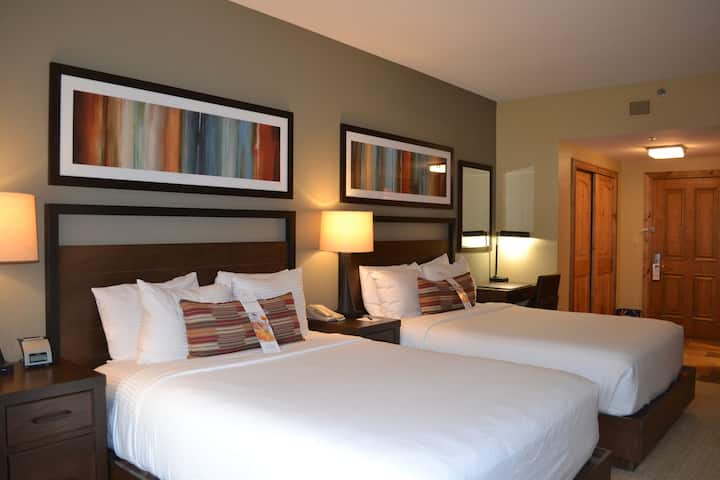 ¡Lujosa habitación de hotel doble queen ubicada en el Grand Summit Resort Hotel con el acceso a pistas de esquí más cercano en Canyons Village! Relájate después de un día en las pistas con una película en la cama. Hay un baño completo, completo con bañera, ducha, inodoro y tocador. ¡Capacidad para 4 personas cómodamente!