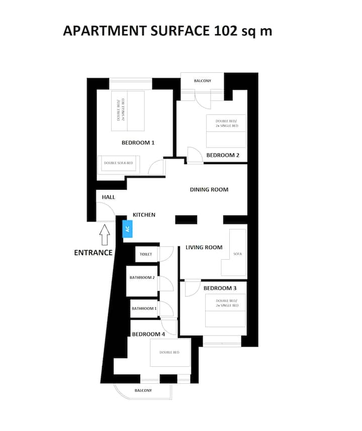 A 5 minutos de la plaza principal, apartamento de estilo de 4 dormitorios.