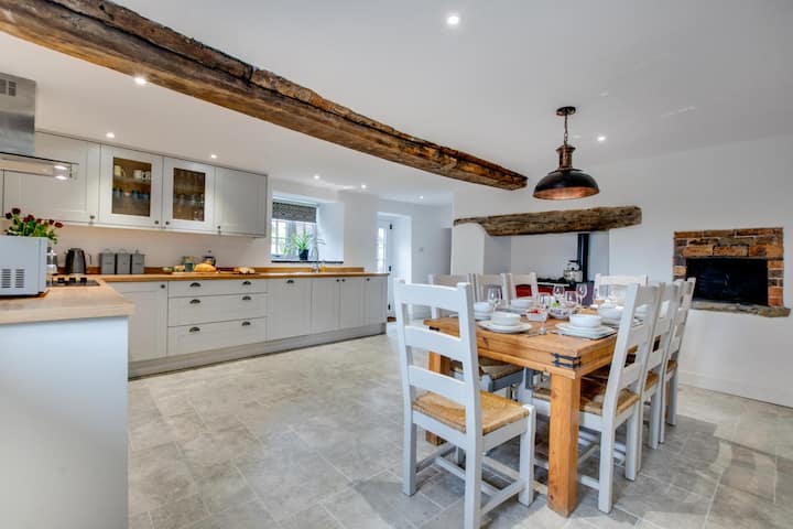 Cocina: gran cocina de granja de planta abierta con vigas expuestas del siglo XVI, Rayburn y un antiguo horno de pan. Esta elegante cocina bien equipada incluye lavavajillas y nevera integrados, horno doble, vitrocerámica, microondas y cafetera. Mesa de cocina de granja con capacidad para 8 personas con vistas a la campiña circundante.