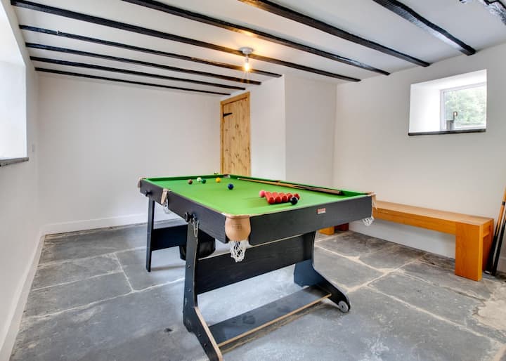 Sala de juegos: sala de juegos bien equipada que solía ser la vieja lechería, tiene pisos de pizarra originales y vigas expuestas. Juguetes para niños, mesa de billar, tenis de mesa, dardos