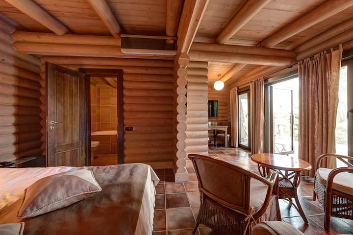 Cabaña de madera en un bosque de pinos