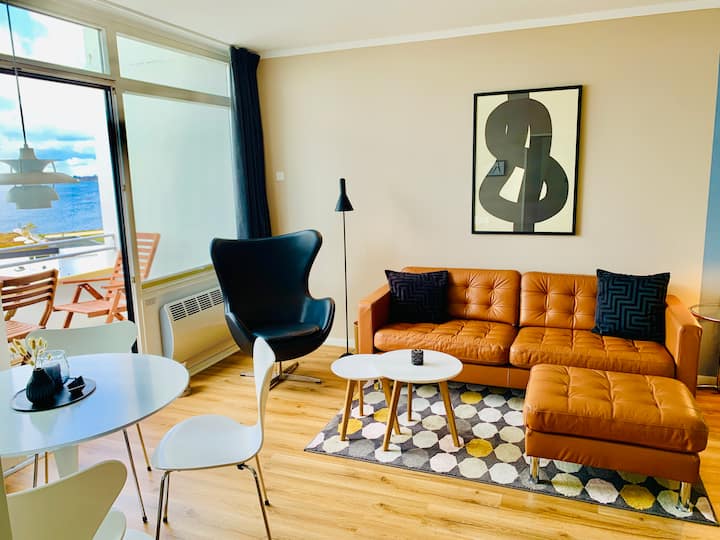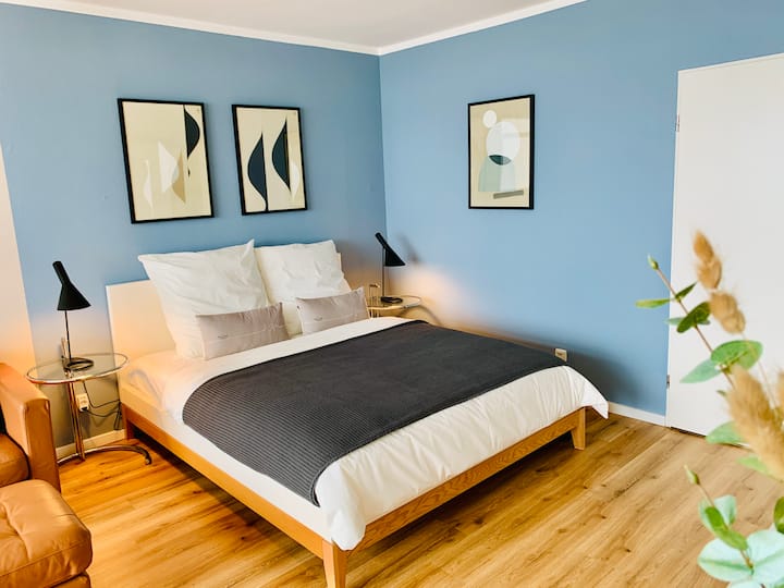 Televisión inteligente grande y pivotable de 55 pulgadas (incluidas aplicaciones para Netflix, Amazon Video, RTL+). Sofá espacioso. Sillón de "huevo" girando e inclinando. Radio Tivoli con Bluetooth. Internet propio del apartamento a través de wifi (hasta 100 Mbps sin límite de volumen). Mesa de comedor con cuatro sillas (Original Arne Jacobsen). Cómoda cama doble (160x200 cm) con dos colchones y protectores de colchón. Cortinas opacas.
