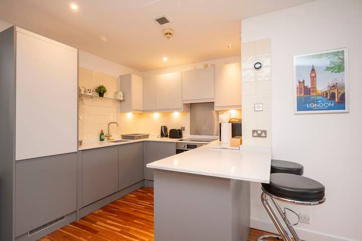 Si estás de humor para cocinar, te encantará la cocina recién renovada (¡actualizada en enero de 2025!). Diseñado tanto para el estilo como para la función, cuenta con una placa de inducción y un horno nuevos, junto con un lavavajillas, una lavadora, un refrigerador, un congelador y un microondas. Ya sea que estés preparando un desayuno rápido o una comida gourmet, esta cocina moderna tiene todo lo que necesitas. Reúnete alrededor de la mesa del comedor para disfrutar de una comida juntos o comparte historias de tu día explorando Londres.
