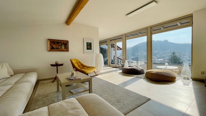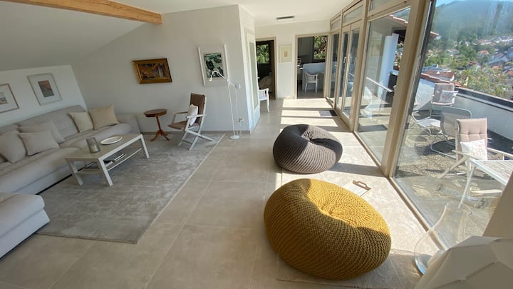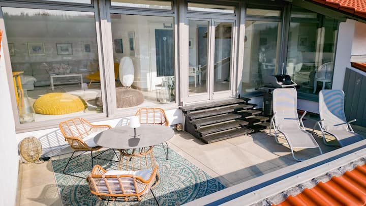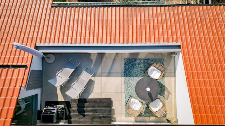 Apartamento con una elegante terraza en la azotea inundada de luz
