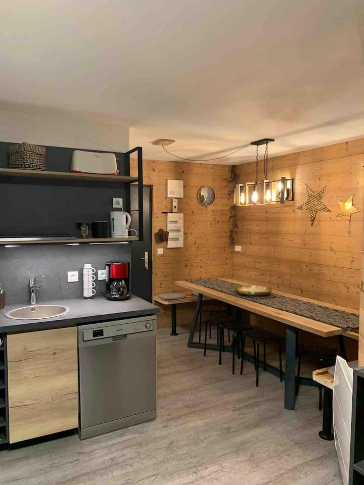 ■ También hay 2 servicios de raclette y un aparato de fondue para no perderse estos IMPRESCINDIBLES de la cocina saboyana. ¡También hay un lavavajillas porque, después de todo, estás de vacaciones! El ventanal da a la primera terraza y garantiza una HERMOSA LUZ.