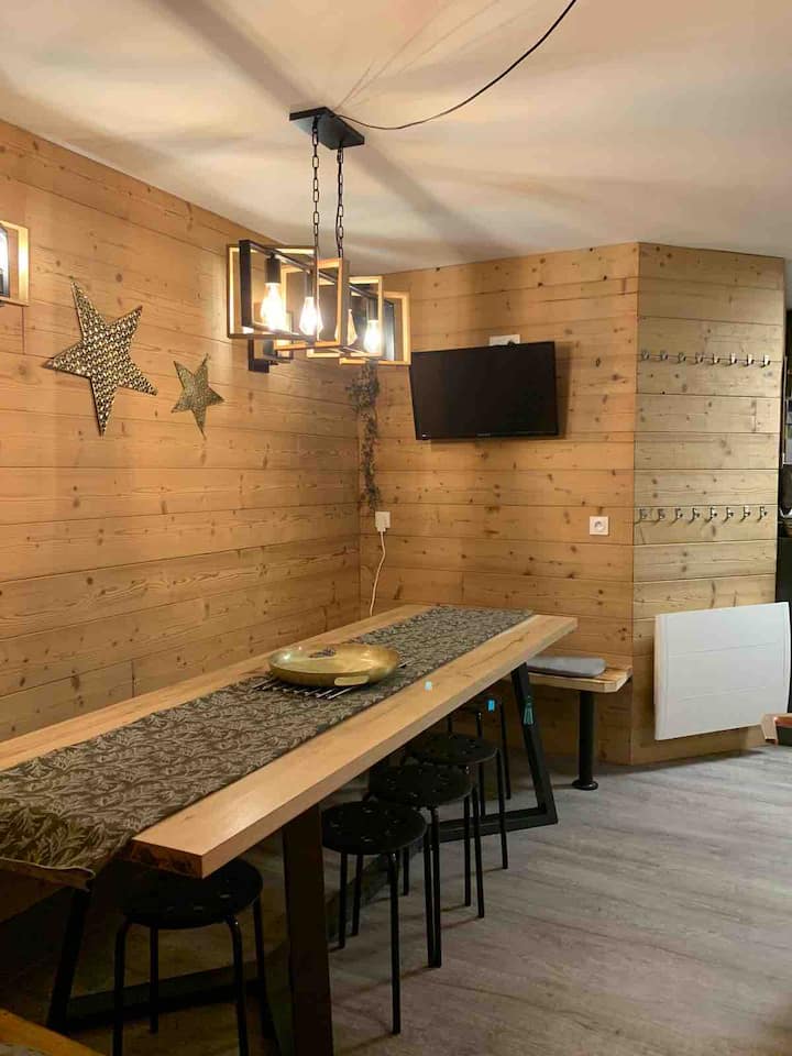■ Luego llega directamente a la sala de estar, en el lado del comedor, con perchas en la pared para dejar sus abrigos. El apartamento ha sido completamente renovado con un alto nivel de equipamiento y una decoración moderna y CÁLIDA que hace hincapié en la carpintería. La gran mesa del comedor tiene capacidad para 12 comensales para pasar buenos momentos compartidos en el «Refugio del Triboulin».