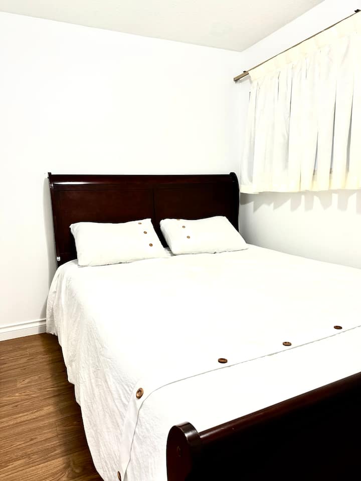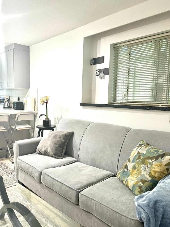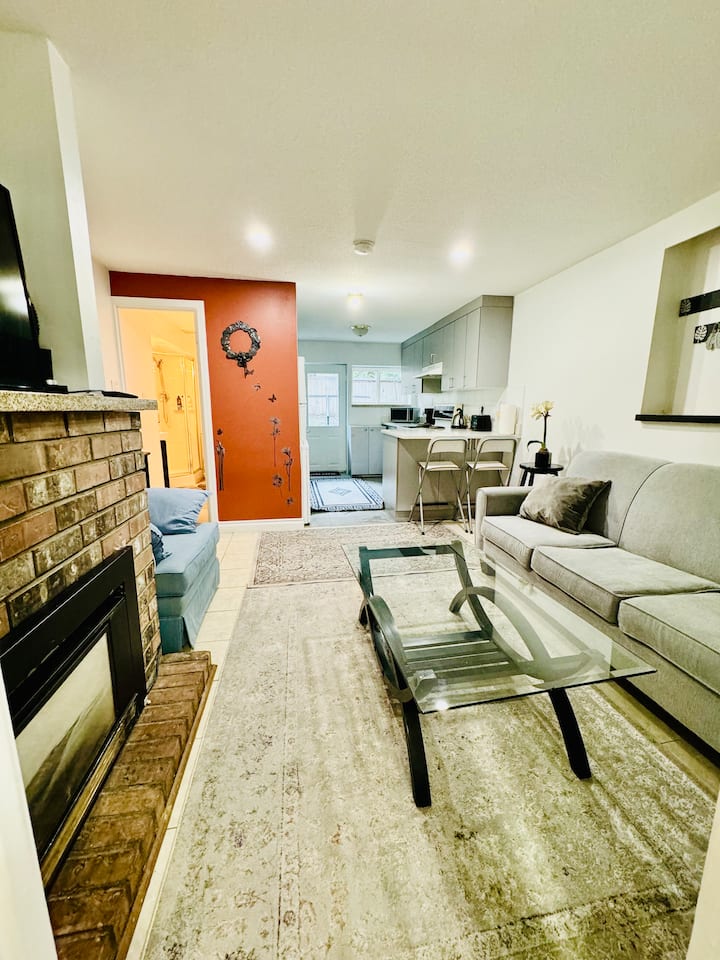 Adorable suite a nivel de jardín con chimenea y cocina.
