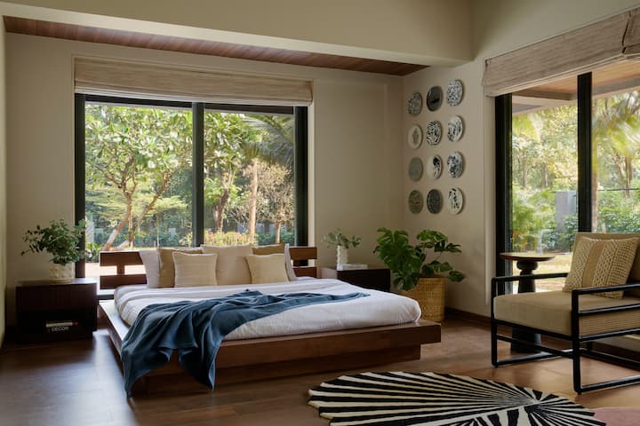 - Ambas habitaciones en la planta baja se abren al patio privado, y todas las habitaciones en el primer piso tienen un balcón adjunto con vistas a la piscina y al jardín.