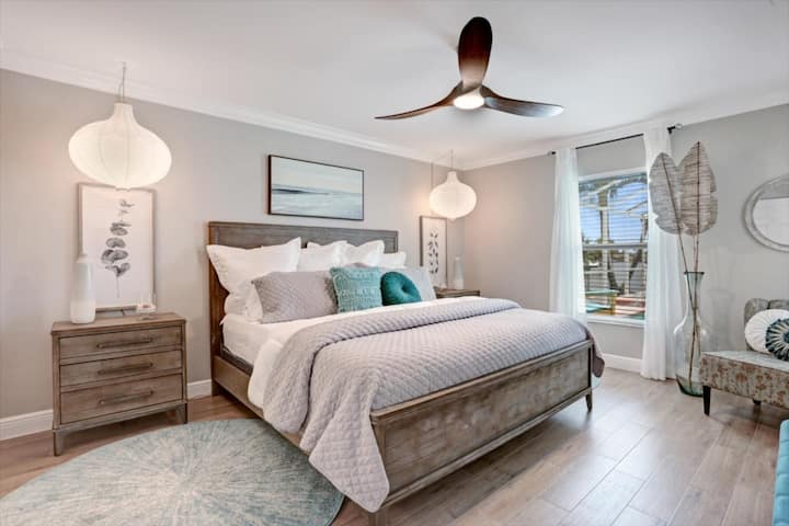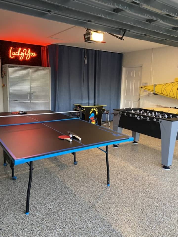 ¡Mejora tu diversión en vacaciones con nuestra sala de juegos de garaje recién convertida, con ping-pong, futbolín, un clásico juego de arcade Pac-Man, kayaks y mucho más! Cuando estés listo para relajarte, sal al lanai cubierto y disfruta de tus programas o deportes favoritos en el nuevo televisor inteligente de 65” junto a la piscina.