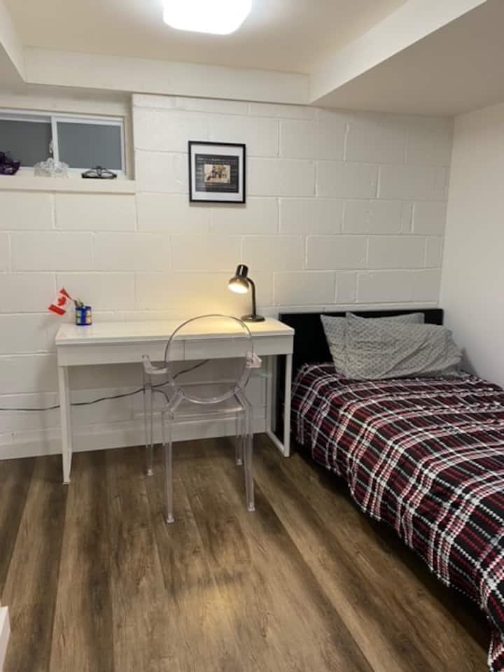 Acogedor dormitorio en el sótano con cama individual