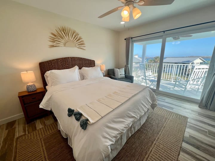 La suite principal está en el nivel superior, tiene una cama tamaño queen, baño privado con ducha a ras de suelo y un balcón privado con vistas a la calzada Intracoastal y Boca Grande.