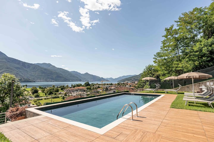 Jardines colgantes, gran área verde con piscina panorámica y jacuzzi climatizado con vistas de 360° del lago de Como y mucho más.