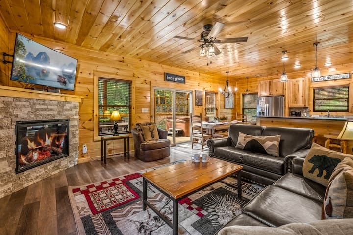 Esta impresionante cabaña de 5 dormitorios mantendrá a tu grupo entretenido con nuestra PISCINA INTERIOR CLIMATIZADA, SALA DE CINE y GABINETES DE ARCADE. Con tres niveles, esta cabaña permite a todos un espacio privado cuando sea necesario, o reunirse en nuestro patio en forma de L para una barbacoa o un chapuzón en la BAÑERA DE HIDROMASAJE para 6 personas. Estamos ubicados a menos de 7 minutos de las atracciones del centro de Pigeon Forge, como el Museo del Titanic y el Museo de Cera de Hollywood. La cabaña está en un RESORT que está muy cerca del centro de Pigeon Forge. La cabaña NO TIENE VISTA A LA MONTAÑA, pero eso significa que no tendrás que lidiar con carreteras de montaña peligrosas y estrechas. Tendrás VECINOS en esta comunidad turística, sin embargo, todavía te sentirás parte de la naturaleza con los árboles directamente detrás de la cabaña.