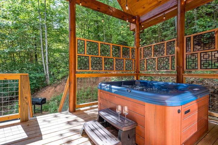 La cabaña tiene una cubierta en forma de L con suficiente espacio para una bañera de hidromasaje para 6 personas y una mesa de comedor de gran tamaño con capacidad para 8-10 personas. Por la noche, enciende las luces de la cuerda y el espacio al aire libre cobra vida. Disfruta cocinando en la parrilla de carbón de 36 pulgadas de ancho y comiendo al aire libre.