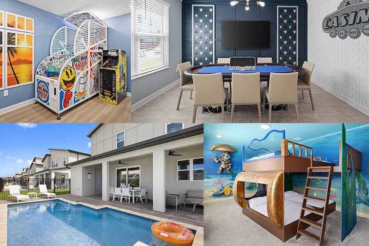 Sumérgete en el estilo de vida de sol y mar con una estancia inolvidable en esta villa elegante y playera en Melbourne Beach, Florida, ¡a solo unos 90 minutos de Orlando! Con una sala de estar/comedor de planta abierta, cocina de alta gama y piscina privada y patio, esta espaciosa casa es el lugar perfecto para echar el ancla. Las comodidades excepcionales incluyen un loft arcade, casino, cine en casa y una habitación para niños con temática submarina. Además, está a solo unos pasos de la playa y a poca distancia en auto de Cabo Cañaveral & ¡Disney World!