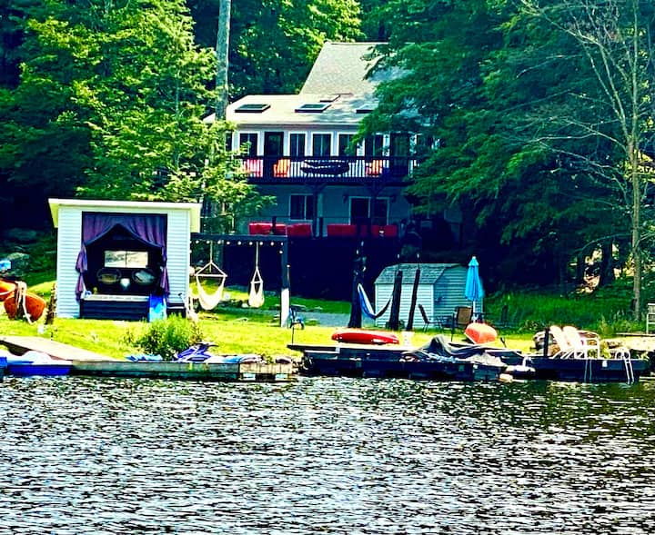 ¿El verdadero factor sorpresa? Impresionantes vistas al lago que cautivan desde el momento en que llegas, enmarcadas perfectamente a través de amplias ventanas delanteras y desplegándose en un impresionante panorama completo desde las cubiertas de varios niveles. Junto con un espacio de juego de dos niveles dedicado lleno de entretenimiento durante todo el año (piensa en ping-pong, mesa de billar, juegos de arcade, futbolín y más), esta luminosa y espaciosa casa del lago Pocono está diseñada para escapadas inolvidables, ya sea una pareja que busca una escapada romántica, un viajero solo que anhela paz y tranquilidad, una pequeña familia o un grupo más grande de hasta 13 huéspedes. Disfruta de una vida interior y exterior sin fisuras, con terrazas que fluyen directamente a tu patio trasero privado y acceso inmediato al lago, perfecto para practicar kayak, nadar, pescar o simplemente sumergirte en las serenas vibraciones frente al agua donde la aventura y la relajación comienzan justo en la puerta de tu casa.