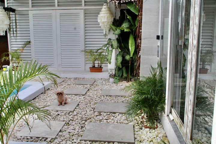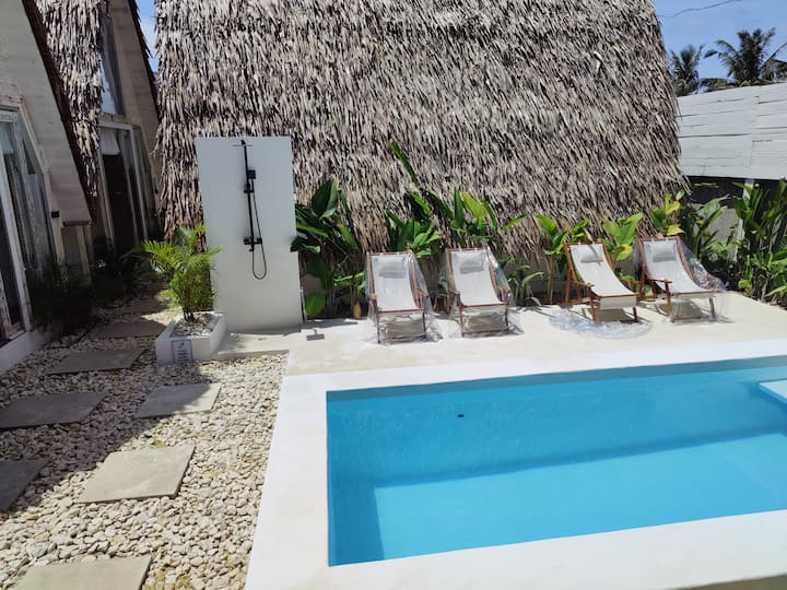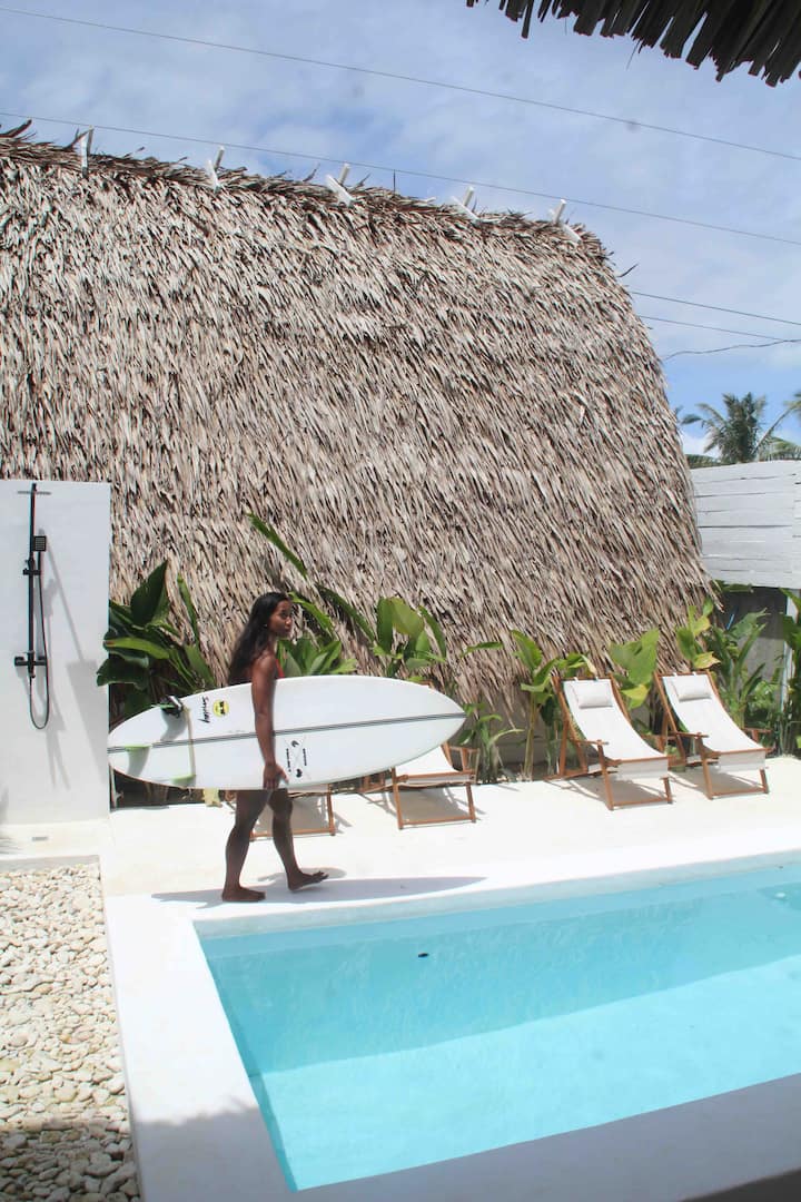 Villa boutique de estilo balinés recién abierta. Con piscina, aire acondicionado, ducha caliente. Tenemos estantes de surf, área de relajación, wifi y área de retiro de yoga. Ubicado en la carretera principal, justo enfrente de la estación de bomberos del General Luna. Damos la bienvenida a los huéspedes con buenas vibraciones y perros hermosos y amigables en todo el complejo.