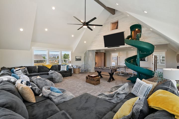 ¡Dé un paseo por la giratoria escalera en el Silo hasta la Sala Familiar llena de entretenimiento para todas las edades! Desafíe a sus hermanos o primos a un juego de ping-pong o futbolín, acurrúquese en nuestros cómodos sofás para una noche de cine en un televisor de pantalla plana de 72pulgadas equipado con acceso a Netflix y Amazon Prime, o reúnase para recordar con la familia o para enseñar momentos en un retiro corporativo. Acomódate junto a las grandes ventanas con vistas panorámicas del lago Bear y las montañas circundantes para leer un libro o tener una conversación profunda y un tiempo de calidad con un ser querido. ¡Aventúrate a subir la escalera de Silo y te encontrarás en otro mundo con una divertida casa del árbol loft para hacer que cualquiera se sienta como un niño de nuevo! ¡Prometemos que sus hijos nunca querrán salir de nuestro caprichoso club de la casa del árbol donde su imaginación puede volar! ¡También puedes reunir a tu grupo para disfrutar de horas jugando en el patio trasero cubierto de hierba! ¡Las posibilidades son infinitas! ¡No olvides que el silo tiene una increíble casa privada con piscina cubierta justo al otro lado de la calle! La piscina se comparte con el granero y la granja (casas de al lado). ¡Reserva uno, dos o los tres alojamientos juntos para mejorar tu comodidad y experiencia para tu grupo!