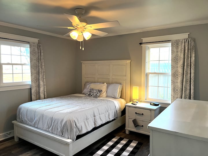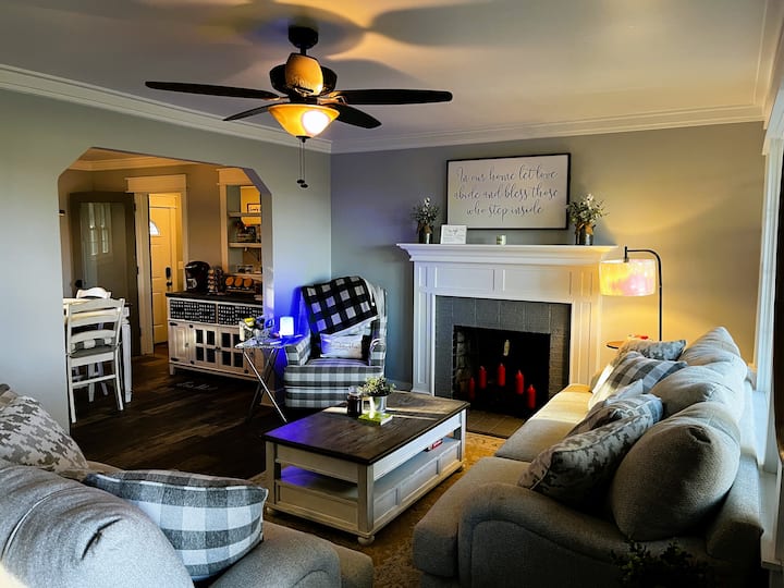 Ven a relajarte en esta casa recién reformada que tiene una sala de estar/comedor abierto que se extiende hasta la zona de cocina totalmente equipada (tostadora, olla de barro, microondas, estufa, licuadora, nevera y barra de café/té con Keurig). Disfruta de todas tus aplicaciones favoritas en el televisor grande de la sala de estar familiar o elige relajarte con un libro de nuestra propia colección en la sala de estar delantera que contiene todos los muebles y suelos nuevos. Cada uno de los 3 dormitorios tiene una Smart TV y wifi rápido para tus necesidades de entretenimiento. La casa tiene capacidad para 7 personas con 2 dormitorios equipados con camas tamaño queen nuevas y el tercer dormitorio tiene una litera y una cama individual. El segundo dormitorio también tiene un acogedor escritorio y silla para trabajar a distancia o también se puede utilizar como tocador/zona de maquillaje. El gran baño del pasillo tiene una bañera, mientras que el segundo baño completo fuera de la guarida tiene una ducha independiente.