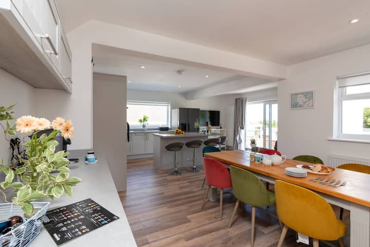 Sandaig está a solo dos minutos a pie de la playa de Benllech, con sus finas arenas doradas y sus aguas azules cristalinas, perfectas para divertirse, remar y nadar de forma segura para familias. En la planta baja, encontrarás dos fabulosos espacios para vivir, comer y entretener. La espaciosa sala de estar está amueblada con dos cómodos sofás, un gran televisor de pantalla plana y una estufa de leña, lo que hace que Sandaig sea ideal para las acogedoras escapadas junto al mar de otoño-invierno. Las grandes puertas del patio conducen a una terraza y al jardín con césped. El comedor de cocina totalmente equipado es de otro mundo, con una isla y una barra de desayuno, una mesa de comedor para ocho personas y otro conjunto de puertas de patio que conducen a la terraza. Desde la cocina, también tienes acceso a una pequeña zona de servicio y a un baño de invitados en la planta baja.
