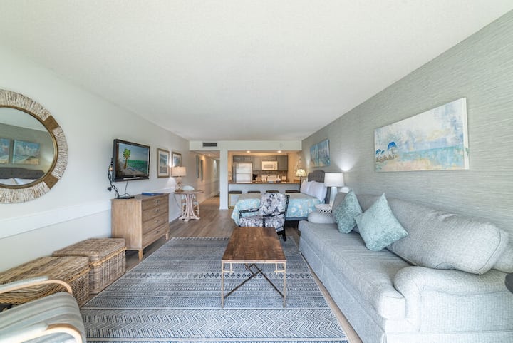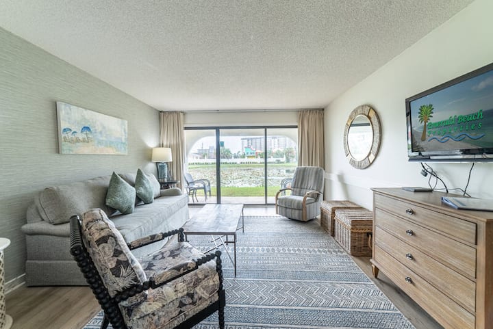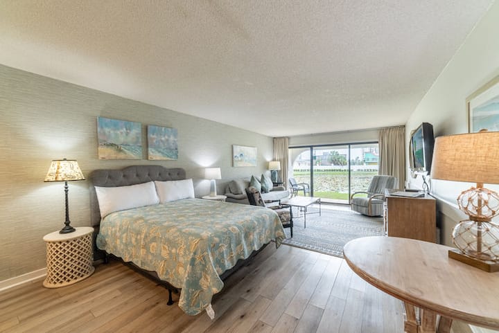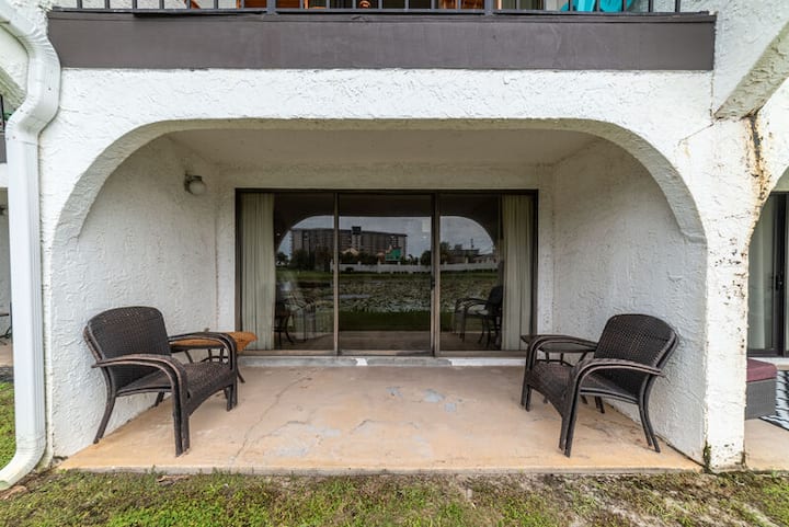 Esta impresionante villa en la planta baja tiene fantásticas vistas al estanque y está directamente en el campo de golf de 9 hoyos y 3 en Edgewater Beach and Golf Resort. Te encantará la gran sala de planta abierta con excelentes vistas. Está amueblado con un sofá cama tamaño queen, un sillón reclinable y una silla lateral tapizada. Hay una TV tamaño king con Roku streaming. También hay wifi Lux Speed en toda la propiedad. ¡Así que asegúrate de traer todos tus dispositivos! El patio de la planta baja está justo a las afueras de la puerta corrediza. Disfruta de tu café y cruasán en el patio principal cubierto mientras observas a las tortugas, aves y peces o a tus familiares y amigos jugando al golf en el campo de golf. ¡Hay muchos asientos para todos!