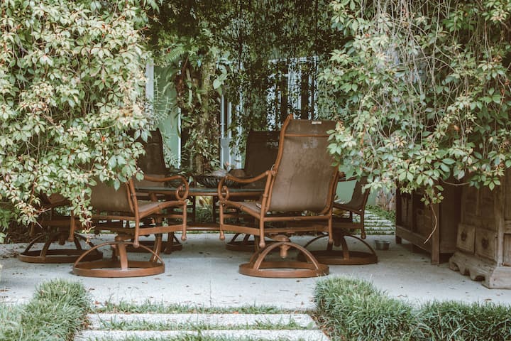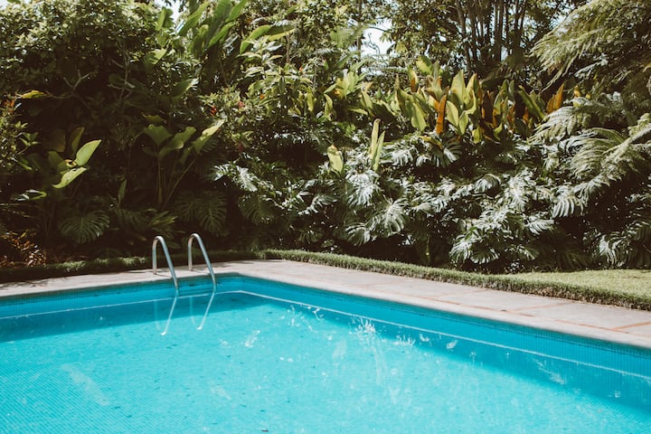 Cabaña rústica y elegante con piscina y jardines exóticos