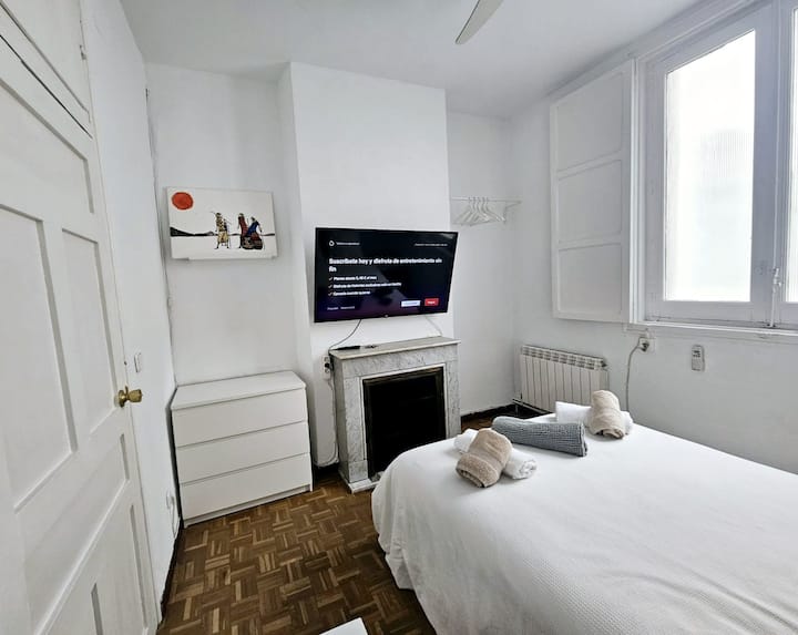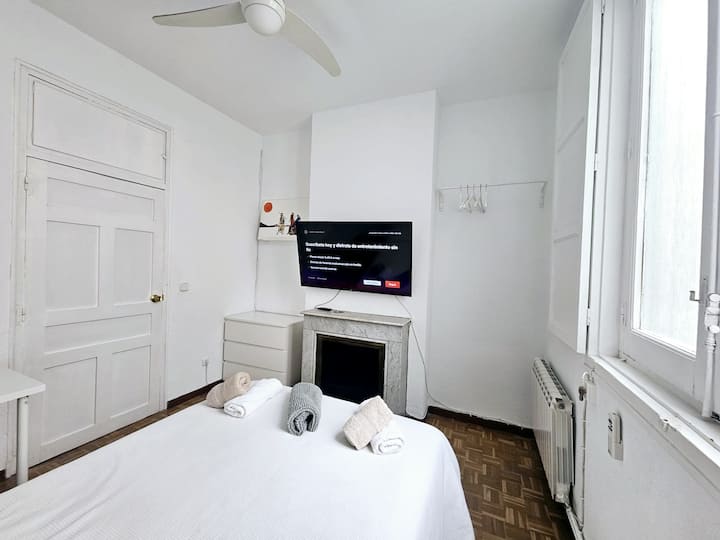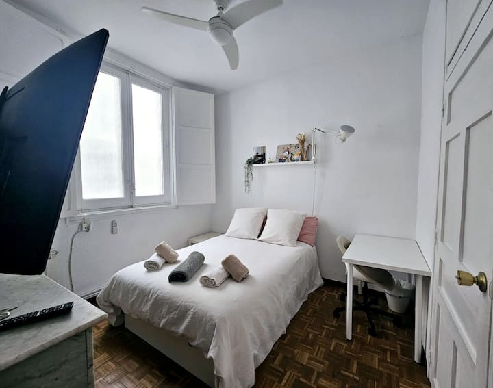 Disfruta de una acogedora habitación privada dentro de mi hogar, en el que también vivo. El espacio está equipado con escritorio, televisión, armario con espejo de cuerpo entero y una ventana que da a un patio interior muy tranquilo, ideal para descansar tras un día explorando Madrid.