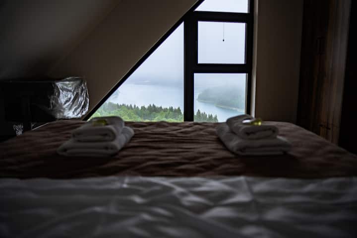 Vistas a: a la montaña y al lago