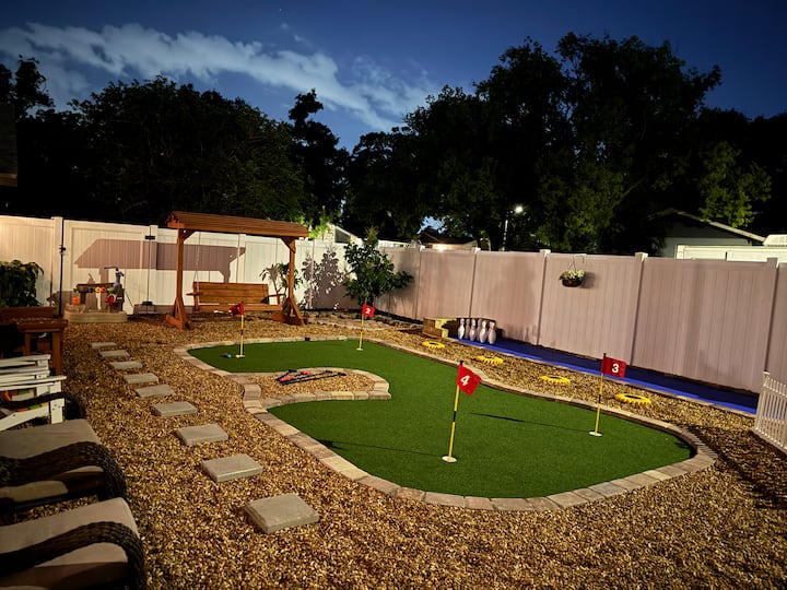 ✨ Nuestro patio trasero es su área de juegos, con juegos al aire libre como cornhole, Giant Connect Four, minigolf y bolos, lo que lo convierte en un lugar ideal para competir entre amigos, relajarse bajo el sol de Florida o descansar en el columpio de madera. ✨