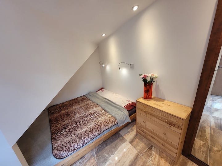 El dormitorio es pequeño, luminoso y cálido y tiene un buen espacio para el almacenamiento. Hay una pequeña cama doble (140 cm x 190 cm) con ropa de cama de calidad proporcionada.