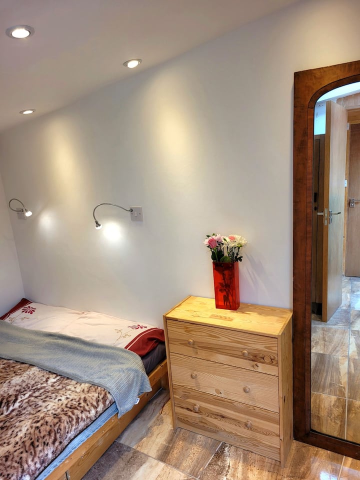 El dormitorio se encuentra justo al lado del vestíbulo de entrada/cocina de invitados y tiene inodoro adyacente privado solo para el uso de huéspedes. La zona de cocina está equipada con hervidor de agua, tostadora, fregadero, nevera y microondas, y con té/café y otros artículos. También hay acceso a la lavadora.