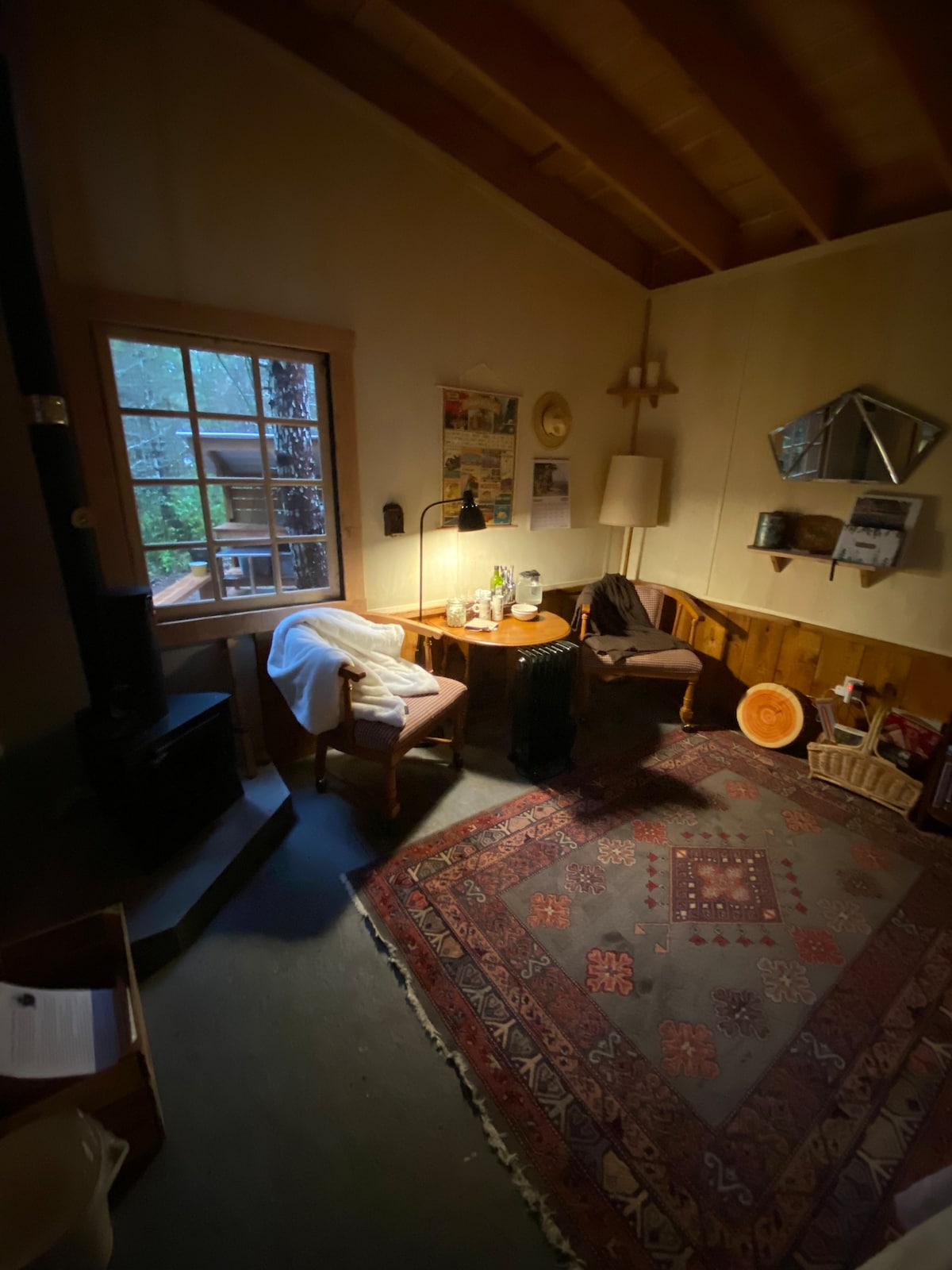 Una cabaña estudio de estilo glamping en un entorno forestal privado. Estás a pocos minutos de hermosas playas oceánicas y rutas de senderismo en la península olímpica. La cabaña tiene una cama tamaño queen y un sofá cama, el más adecuado para 3 adultos como máximo o 2 adultos y 2 niños. Cafetera, nevera pequeña, microondas, chimenea interior eléctrica, fogata de propano al aire libre, fregadero de campamento al aire libre, quemador superior de propano. Ducha de agua caliente al aire libre con lavabo en la parte delantera. No hay agua potable para beber. El inodoro es un inodoro portátil.