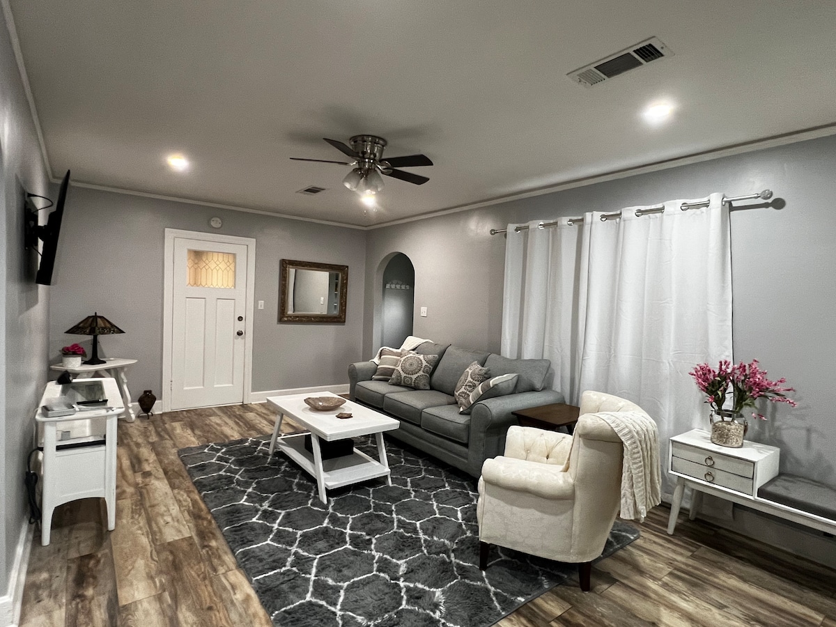 Espacio tranquilo, acogedor y cómodo para desconectar y relajarse. Ubicado en un barrio céntrico, tranquilo e histórico, perfecto para caminar. El patio trasero es ideal para asar a la parrilla, un fogón y cenar. Transmite tus series y películas favoritas en el televisor de 55 pulgadas. Disfruta de tu estancia cocinando tus propias comidas en nuestra cocina totalmente equipada. Hay una bañera de inmersión profunda disponible para tu comodidad. Termina tu estancia con las mejores noches de sueño en nuestras camas de lujo. ¡Despiértate renovado para tu día!