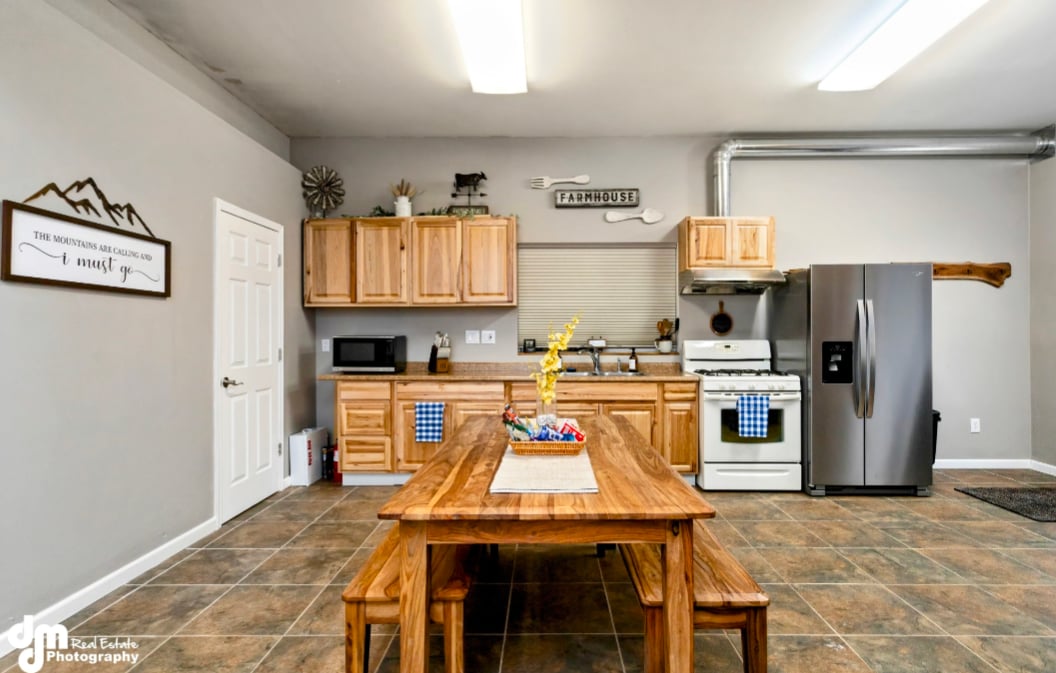 Preciosa, cómoda, decoración de cabaña con enormes ventanales. Esta magnífica casa de troncos es nueva y tiene capacidad para 6 personas. El gran loft de arriba tiene una cama tamaño king, armarios empotrados y TV de 24 pulgadas. El segundo dormitorio de abajo tiene una cama tamaño queen, armarios empotrados y excelentes vistas. La cocina está totalmente equipada con electrodomésticos GE serie «Slate» y todo lo que necesitas. Gran habitación con TV 4K HD de 52 pulgadas y acceso a tus cuentas de streaming, WIFI RÁPIDO, preciosa estufa de leña acogedora para las noches frías. Bonito baño y lavadora y secadora de tamaño completo.