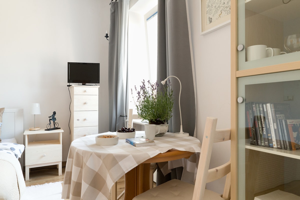 Si quieres vivir en el corazón del casco antiguo y estar cerca de todo, y al mismo tiempo disfrutar de la paz y la tranquilidad y de una hermosa vista del río Vístula, ¡nuestro apartamento es para ti! Está recién renovado, con todas las comodidades, y al mismo tiempo te permite sentir la historia. Se encuentra en un antiguo granero, en la famosa «Casa de los Profesores», a la que conduce un pintoresco puente.